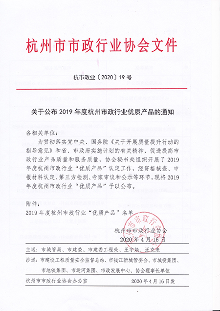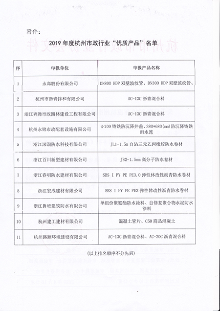 浙江省杭州市市政行業(yè)協(xié)會辦公室發(fā)布了2019年度杭州市政行業(yè)“優(yōu)質(zhì)產(chǎn)品”認定結(jié)果。為貫徹落實黨中央、國務(wù)院《關(guān)于開展質(zhì)量提升行動的指導意見》和省、市政府實施計劃的有關(guān)精神,促進提高市政行業(yè)產(chǎn)品質(zhì)量和服務(wù)質(zhì)量,杭州市市政行業(yè)協(xié)會秘書處組織開展了2019年度杭州市政行業(yè)“優(yōu)質(zhì)產(chǎn)品”認定工作。經(jīng)資格核查、申報材料認定、第三方檢測、專家審議和公示等環(huán)節(jié),我公司生產(chǎn)的“JS2高分子防水卷材""榮獲2019年度杭州市政行業(yè)“優(yōu)質(zhì)產(chǎn)品” 稱號。